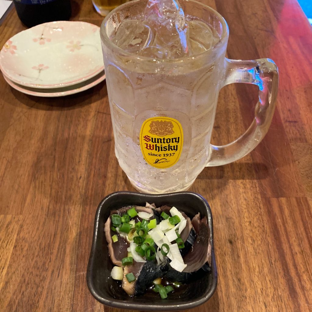 ハイボールと、お通しのかつおのたたき。